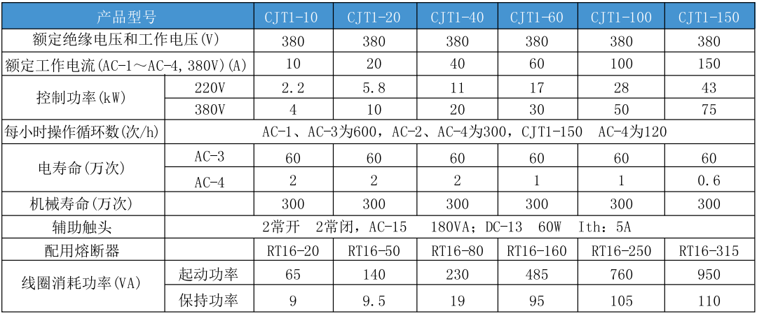 CJT1系列交流接触器(以下简称接触器),主要用于交流50Hz(或60Hz),在AC-3使用类别中额定工作电压380V时,额定工作电流至150A的电力线路中,供远距离接通和分断之用,并可与适当的热继电器组成电磁起动器,以保护可能发生操作过负荷的电路。同时也是CJ10系列接触器的替代产品。