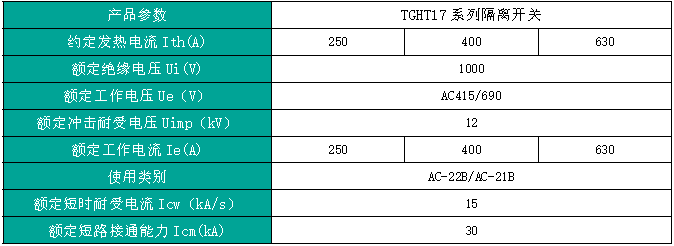 TGHT17 系列隔离开关,主要用于额定电压AC415V/AC690V (50Hz),约定发热电流至630A 的配电电路和电动机电路中,作为电源开关、隔离开关、应急开关,但不作为直接启、停电动机之用。